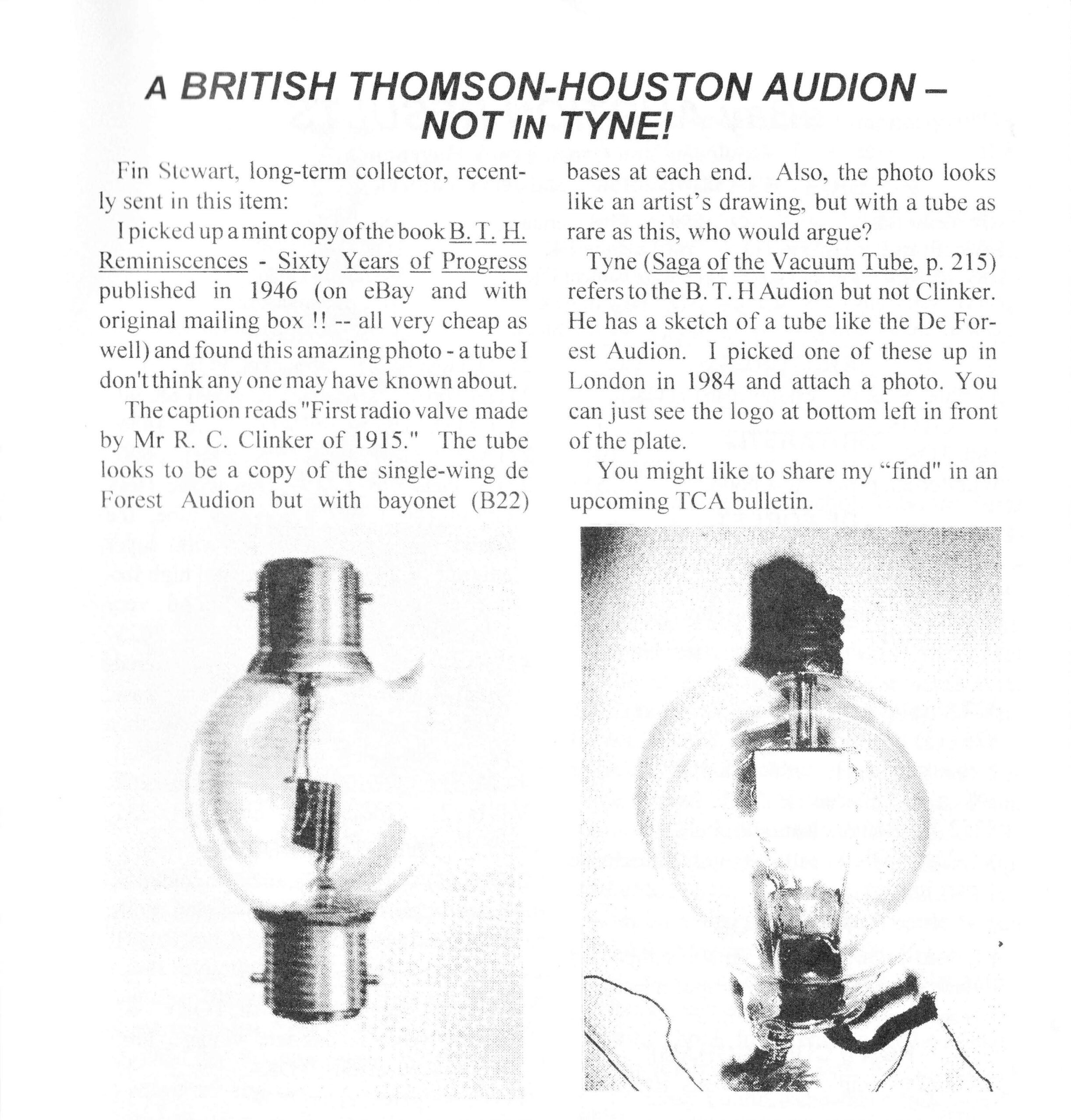 “Tyne’s (Saga of the Vacuum Tube), p. 215 refers to the BTH Audion but not Clinker. He has a sketch of a tube like the DeForest Audion. I picked up one of these up in London in 1984 and attach a photo. You can just see the logo at the top center on the left in front of the plate. You might like to share my find in an upcoming TCA bulletin.” End of quote.