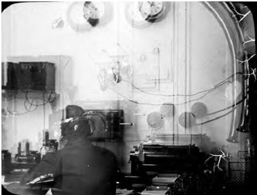 The before repair picture above is the un- cropped double exposure taken by amateur photographer Father Francis Browne on April, 12th, 1912 and was just one of a good number of photos taken on his journey from Liverpool, where he was studying to become a Catholic priest. From Liverpool he would travel by rail to Southampton station in London, the location of the Titanic to embark on his short trip via the Titanic from Southampton to Cherbourg, France, to pick up mail and passengers, then on to Queenstown, Ireland where he was to dis-embark. These are all of the photos, in the hyperlink, I am aware of Browne’s trip from Liverpool, to Southampton, to Cherbourg, France, to Queenstown, Ireland: Here: FBP As can be seen, what appears to be a Fleming valve is mounted on the wall in a Marconi device to the left of the operator. Harold Bride is the operator that is blocking sight of the Marconi equipment in front of him but that may or may not include a Fleming valve. At the point this picture was taken, Bride was probably sending and receiving passengers’ messages without the use of a valve?