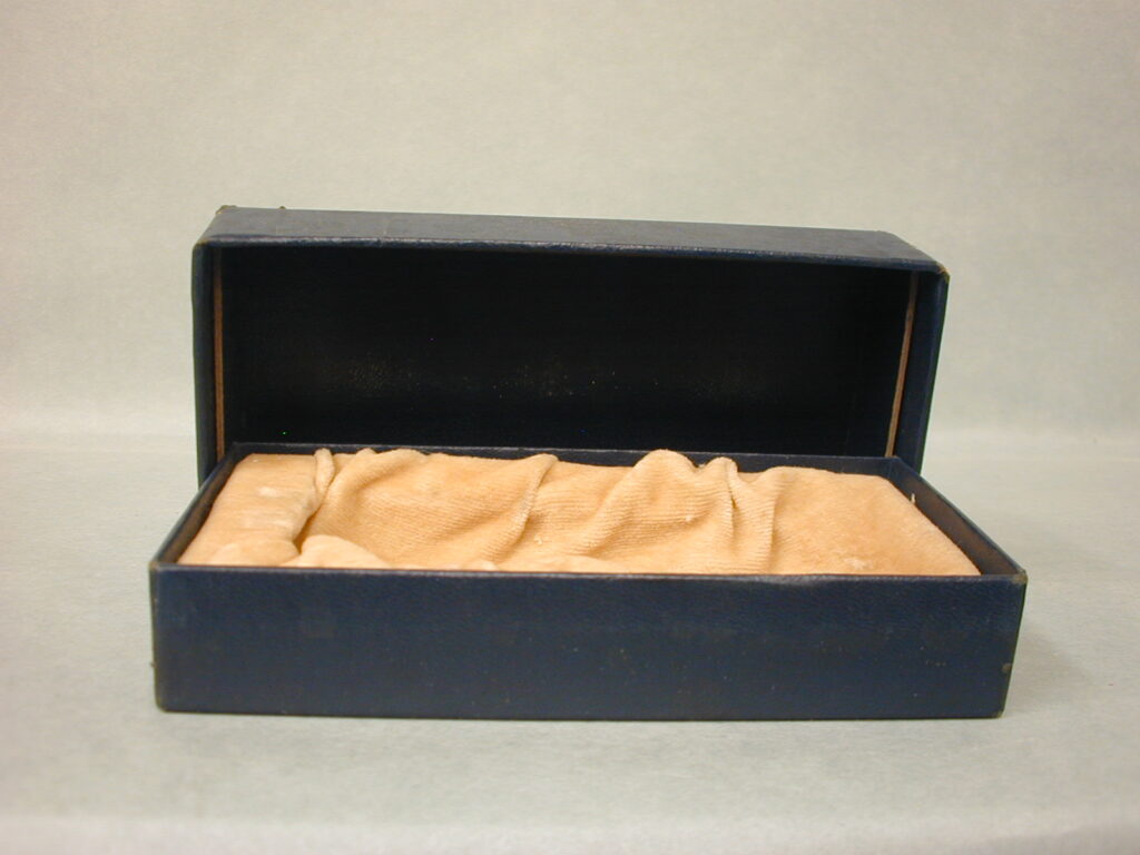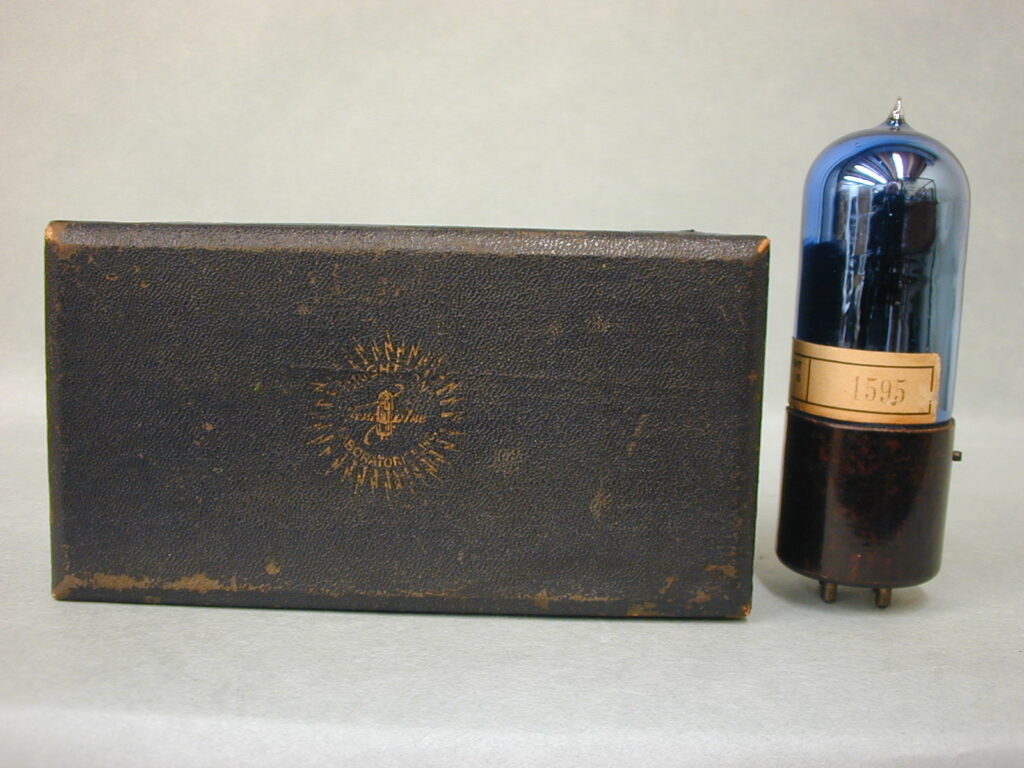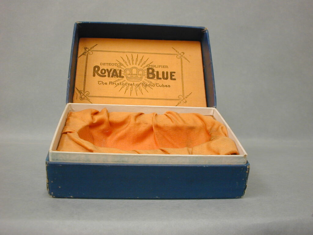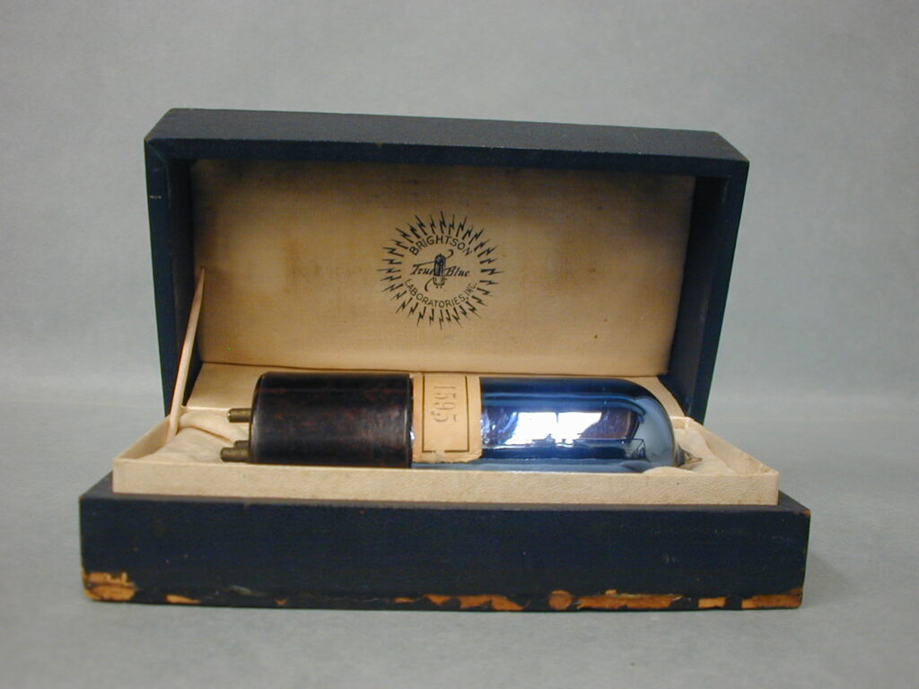 Figs. 3 and 4. The blue Brightson vacuum tube, with the inked paper tag stating a very early production number of 1595, came in this one tube presentation box. The box itself is different shaped with rounded corners that can be seen under the blue covering and is larger than normal. The early production number on the paper tag coupled with the different box design may indicate it some of the first made by Brightson?