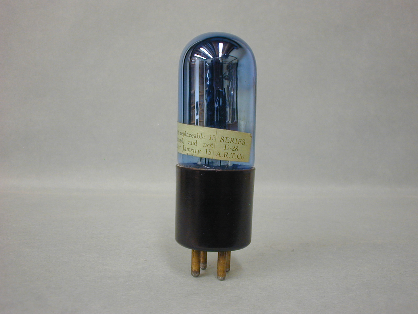 Fig. 7. To me, this is a mystery UX 01A tube made much like a Brightson with the mottled maroon Bakelite base. The paper tag states Series-28 and was made by the A.R.T. Company. Arcturus shipping boxes say Arcturus Radio Tube Company so is the A.R.T Company words, for short mean, that Arcturus made the tube? I have posed the question to a group of collectors withouit an answer yet.
