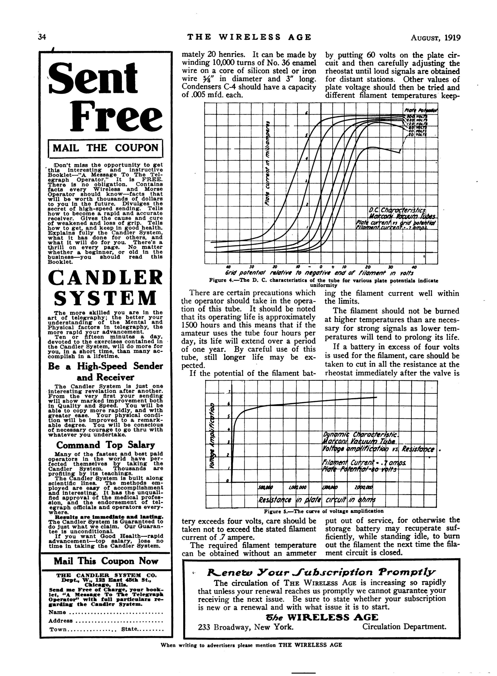Fig. 25 and 26. Marconi insisted that the new Moorhead tubes now be called the VT, as can be seen in the ads. The changes in the contract would mean a new design in the shipping boxes. Compare the wording in the July and August ads above. The July ad simply mentions the new Marconi VT while the August ad, for the first time mentions the Class 1 and class 2 tubes being offered. The hard A class 2 was to be used a detector and the soft B class 1 as an amplifier. The American Marconi Co. disliked the soft tubes and thought the hard versions were a much better all-around choice. Amateur operators, however, thought the soft tubes, when used correctly, gave them much better sensitivity, and preferred that version, similar to the Deforest audion, under certain conditions, could be an amazing receiver. This fact did not resonate with Marconi and their sales suffered. Also, the shipments of both types, A and B from Moorhead showed a good percentage did not work. It was later found that Marconi’s testing methods were faulty and with the proper testing, the tubes considered faulty would have been very low. In any case, an article on testing of the Marconi VT’s, from the magazine “Wireless Age” in 1920, was too early to be considered a good method. Never-the-less, the article can be read here: TM_V.pdf